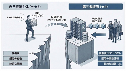 しかし、★4は決定的に異なります。★4の獲得には、「ルールが例外なく、かつ継続的に守られていること」を第三者(審査機関)に対して客観的に証明しなければなりません。この「ルールがあること」から「守られていることを証明すること」へのパラダイムシフトこそが、多くの企業が直面する最大の壁となります。