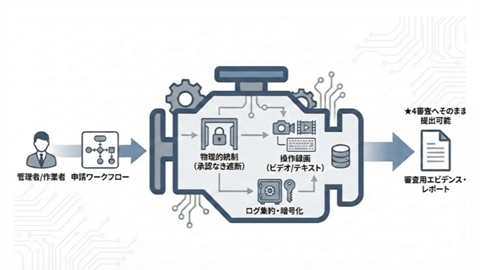 これらの高難度項目をクリアするために、個別の対策を積み上げるのは非効率です。ここで提唱したいのが、特権ID管理(PAM)ツールを、単なる「セキュリティ対策ツール」ではなく、評価項目を網羅的にパスするための「エビデンス生成エンジン」として再定義する考え方です。